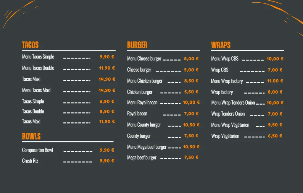 Chez Tacos Factory Dijon, vous pouvez composer votre tacos personnalisé avec 1, 2 ou 3 viandes, choisir votre sauce et vos suppléments pour un repas sur mesure. Nous proposons également une sélection de burgers savoureux, de wraps croustillants, de bowls gourmands et plusieurs desserts.